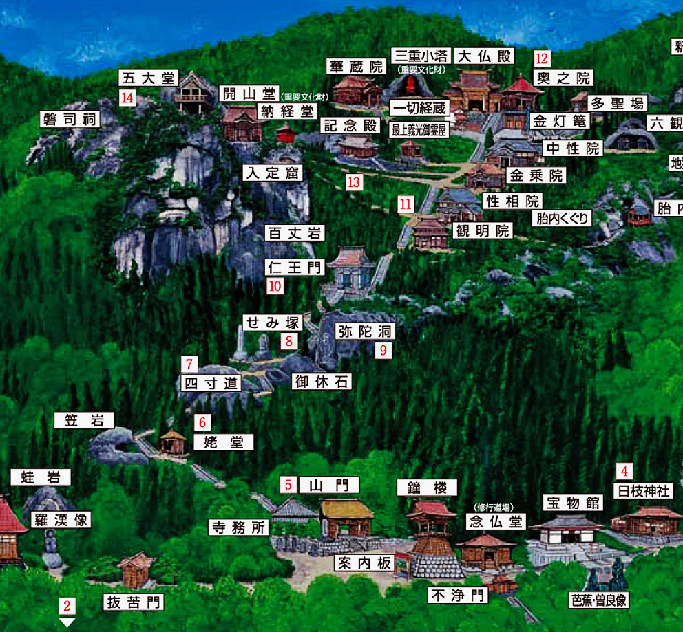 上の地図まず12番の奥之院を目指し、14番五大堂を最終の目的地とします。