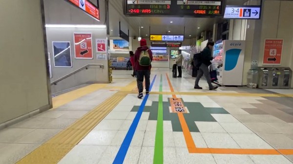 駅待合室で、コインロッカーに大荷物を預け防寒対策を準備。耳当て手袋、念のためシューズにはかんじきを取り付けレインコートを着用。