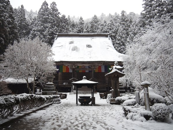 根本中堂は1356年山形城主 斯波兼頼が創建、17世紀初め最上義光が大修理をして現在の姿に伝えています。 入母屋造りで銅板葺の内陣には鎌倉時代の一本彫秘仏本尊、薬師如来座像が安置されています。 国指定の重要文化財でブナの建造物としては日本最古を誇ります。