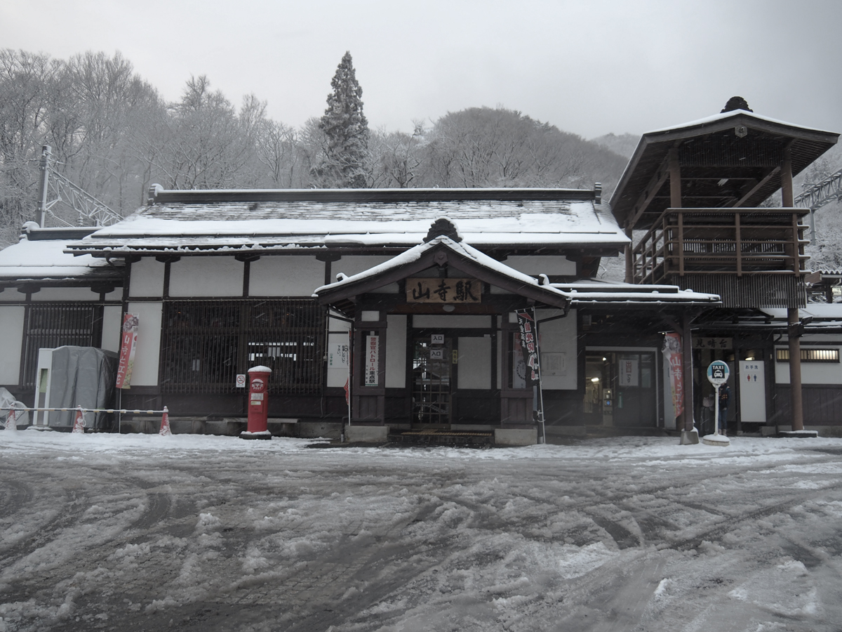 駅待合室から山寺を望む。待合室は暖房が効いて暖かい♨