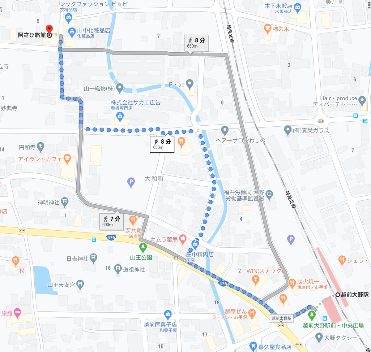 map大野駅から阿さひ旅館
