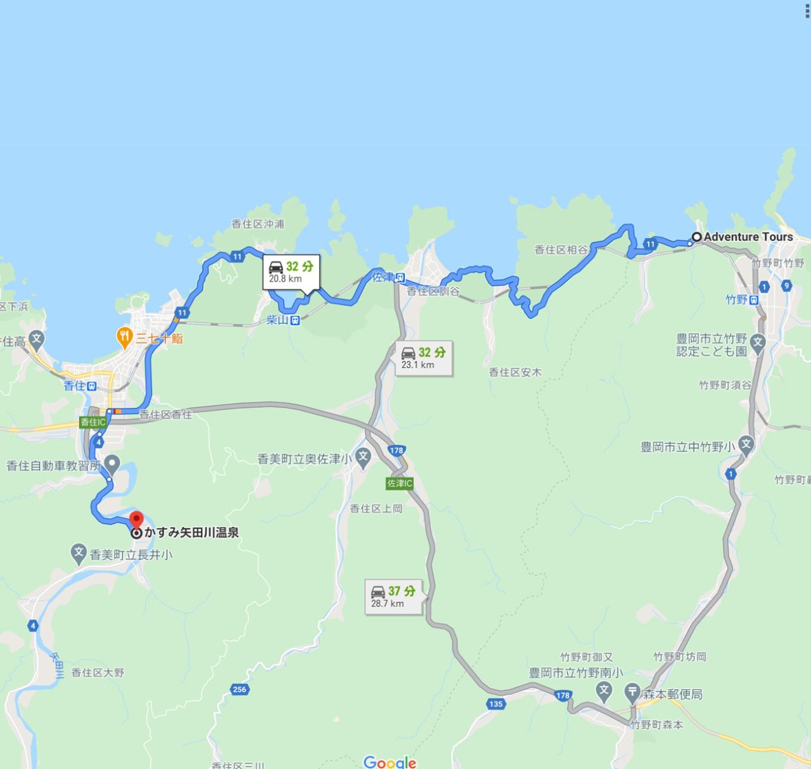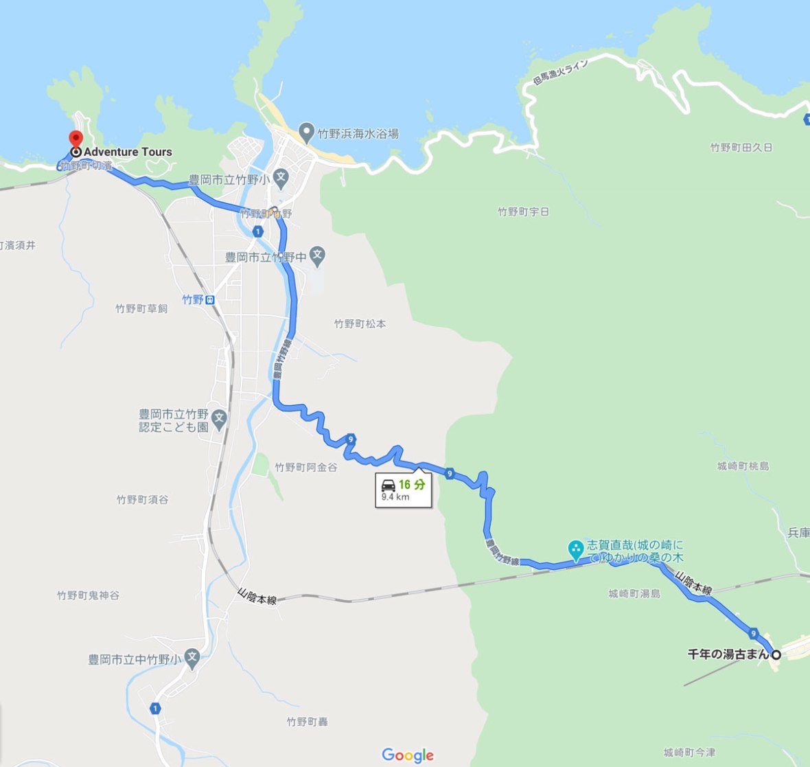 城崎温泉から竹野までは約9キロ、約30分もあれば到着いたします。
