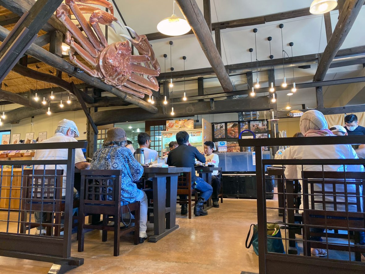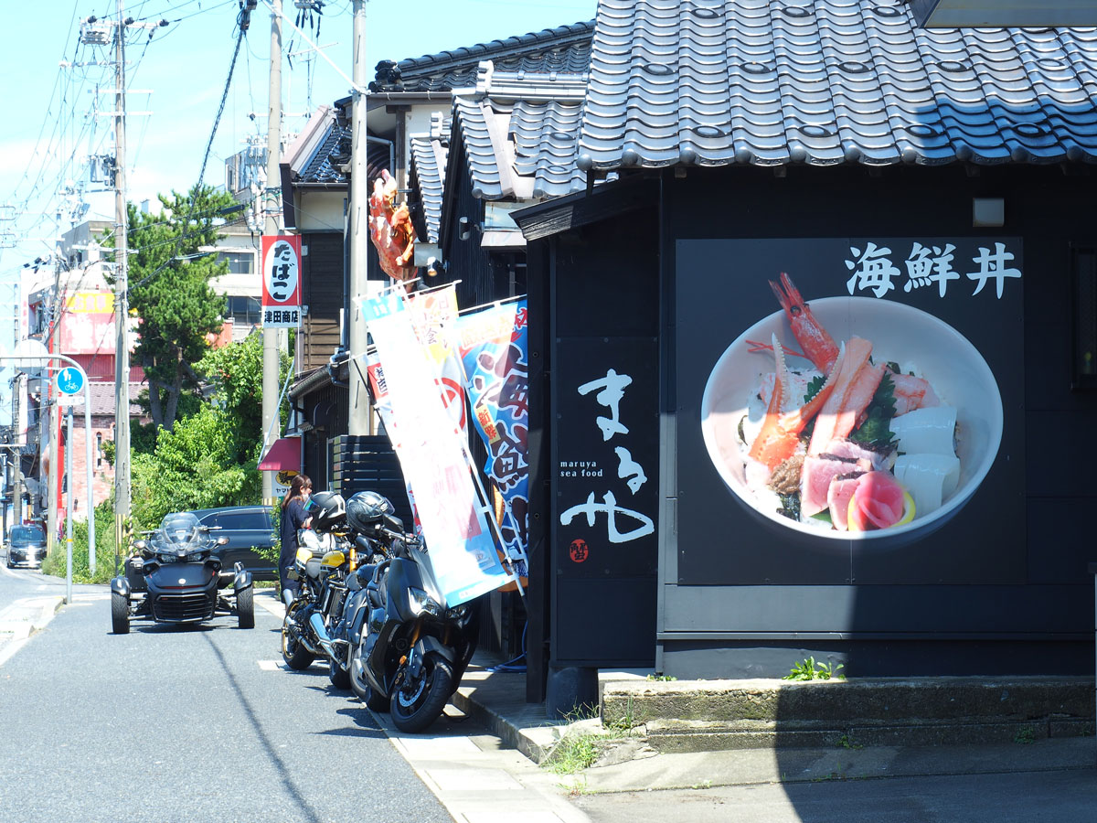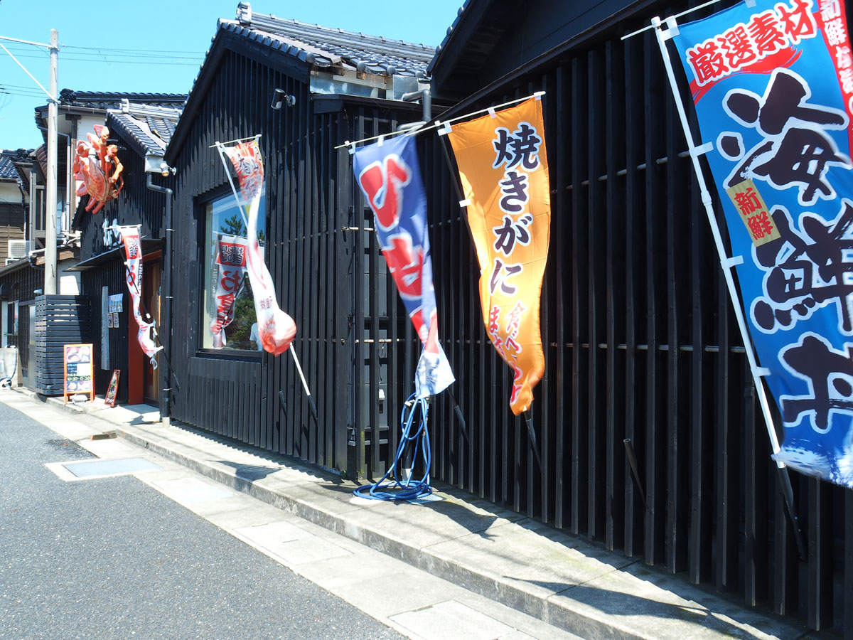 香住漁港からほど近く、海鮮丼や焼きガニののぼり旗が目に付く「カニ工房まるや」さんに到着。