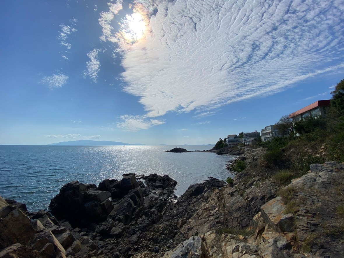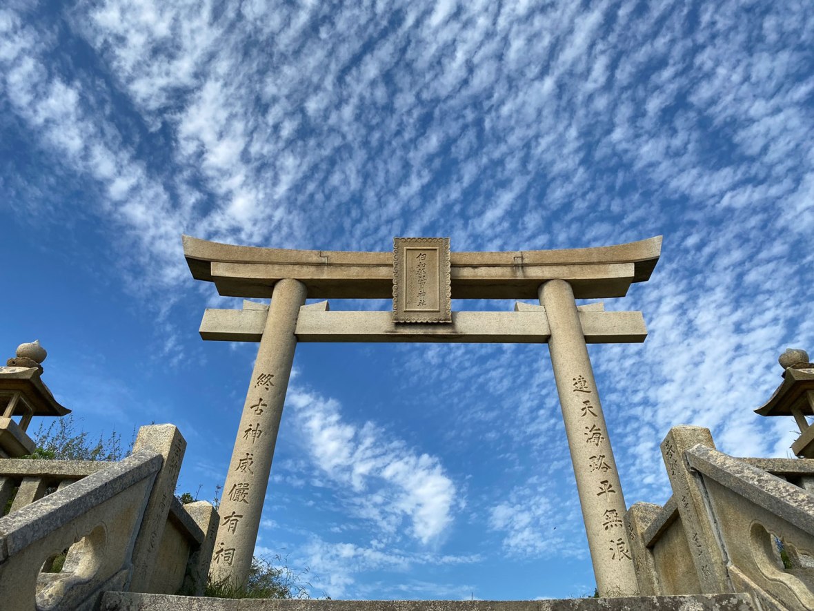 鳥居の外側(海側)は階段が続き、下から見上げると大きな空にいわし雲が連なります。