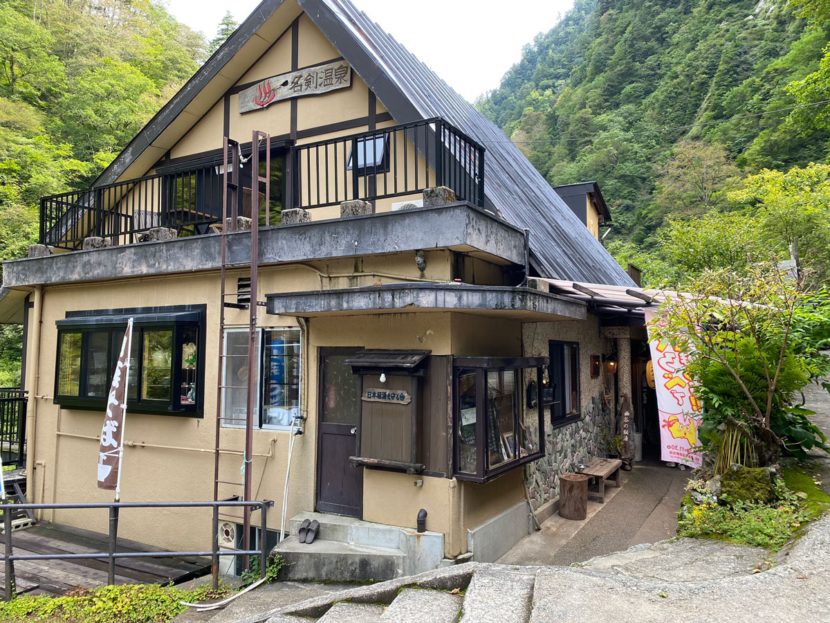 振り返ると、名剣温泉の建屋が見えます。少し下にあるのが温泉でしょうか。