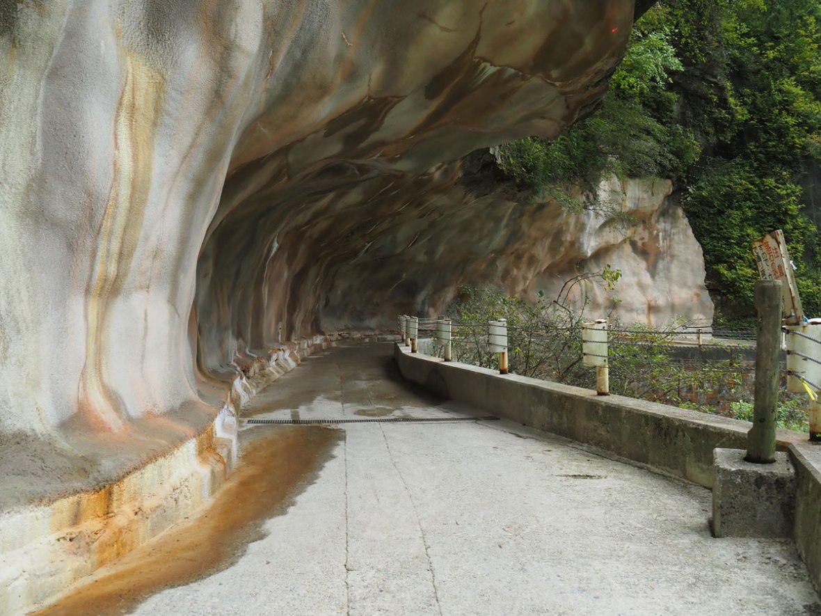 落石防止のシェルターを超えます。たまにと言うか一度だけでしたが、車に出会います。恐らく祖母谷の管理局などの車だとは思いますが、かなり狭い箇所が続くところもあるのですが大丈夫なんでしょうか。