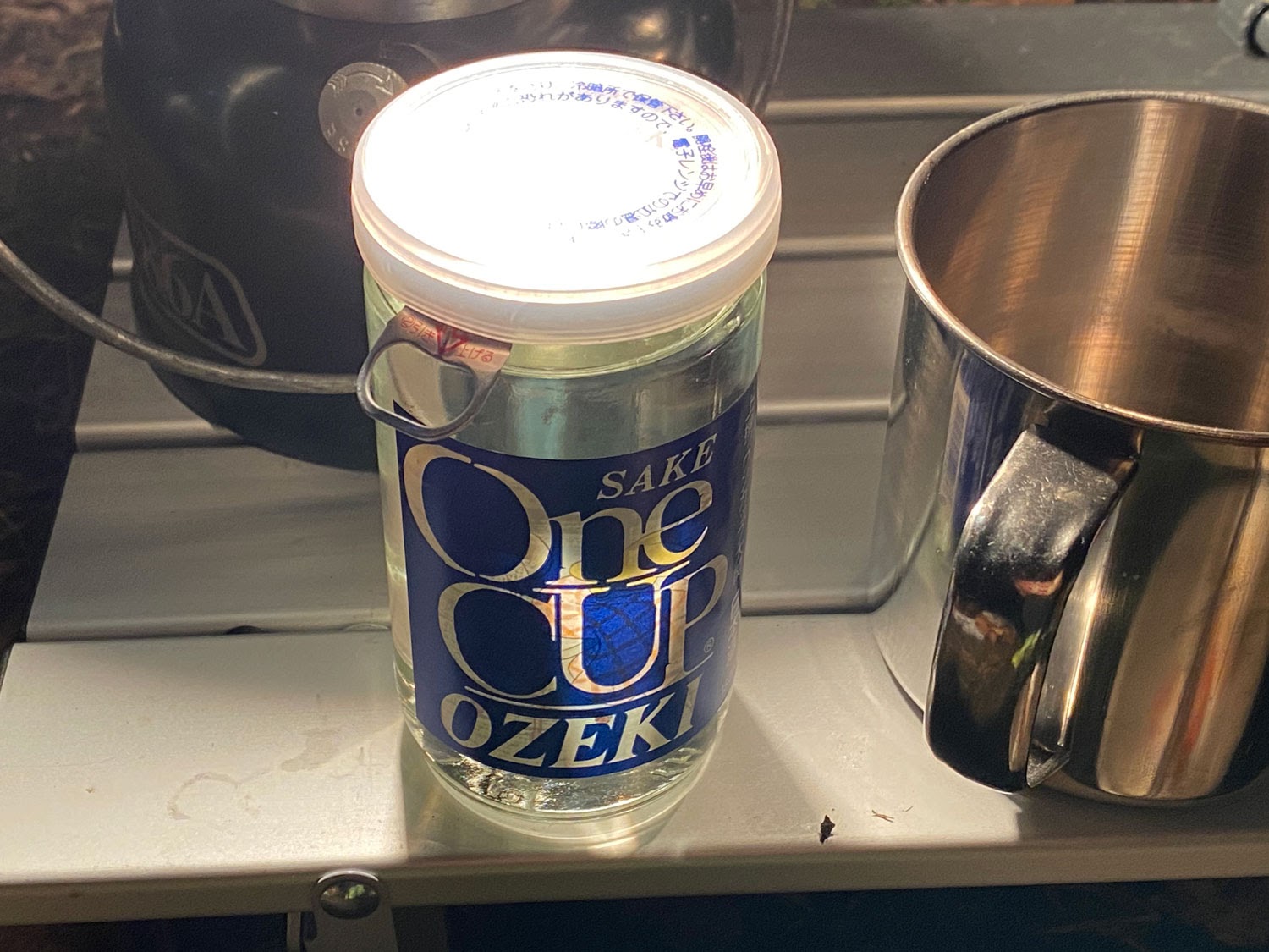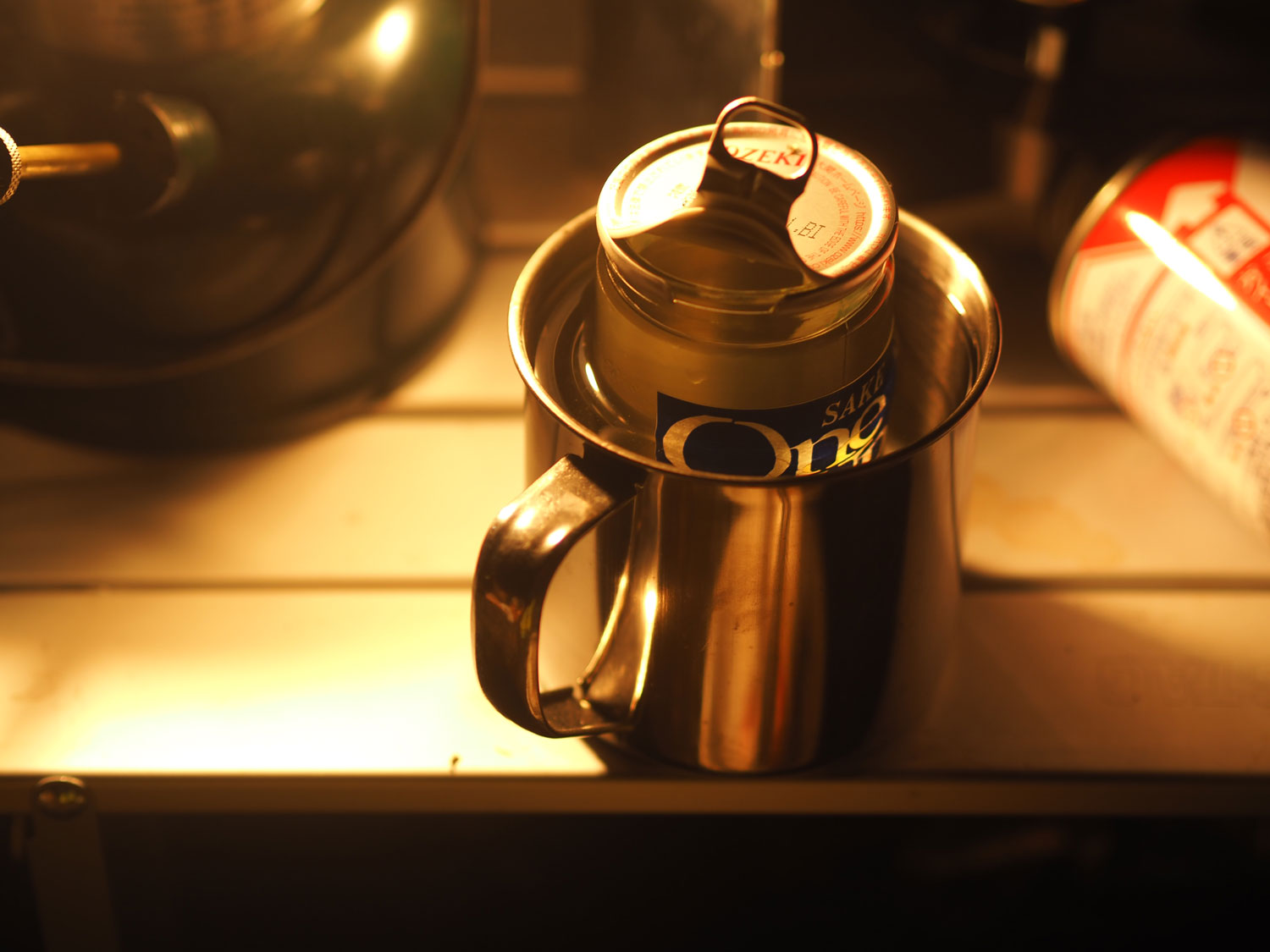 アツアツのお湯をマグカップに注ぎ、そこにワンカップ入れて暖かく熱燗にいたします♨