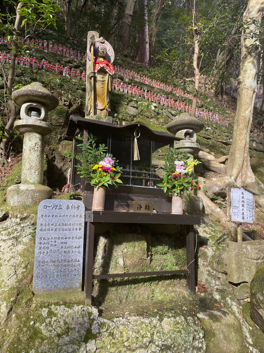 岩山の堂々と立つ舞台造りが圧巻な建物摩尼殿を参拝して、地蔵菩薩が並ぶお堂を参拝。