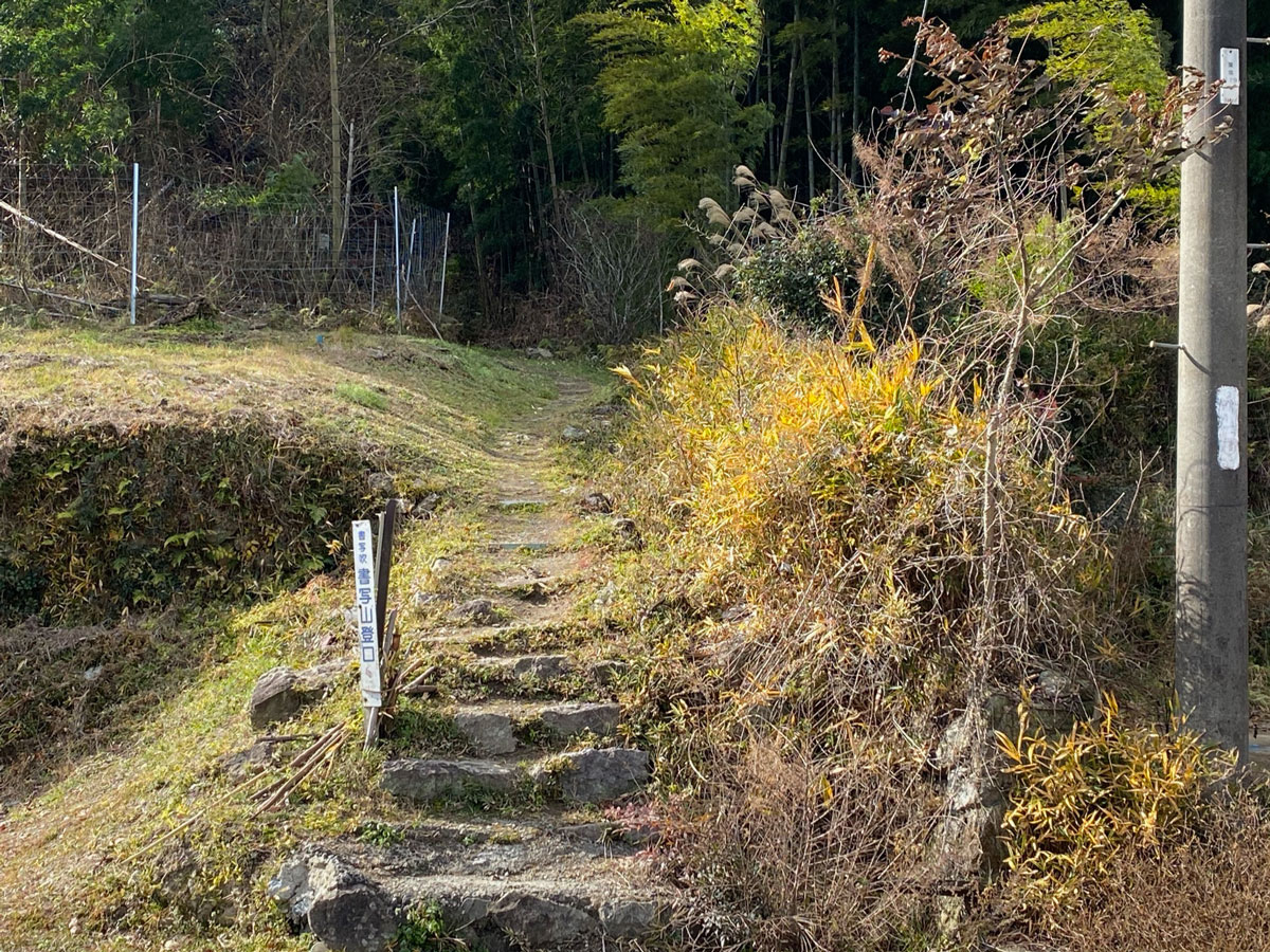 しばらく進むと、下山後に出てくる予定だった坂道を横目に道路を進みますと、すぐに置塩坂参道の登山口に到着。