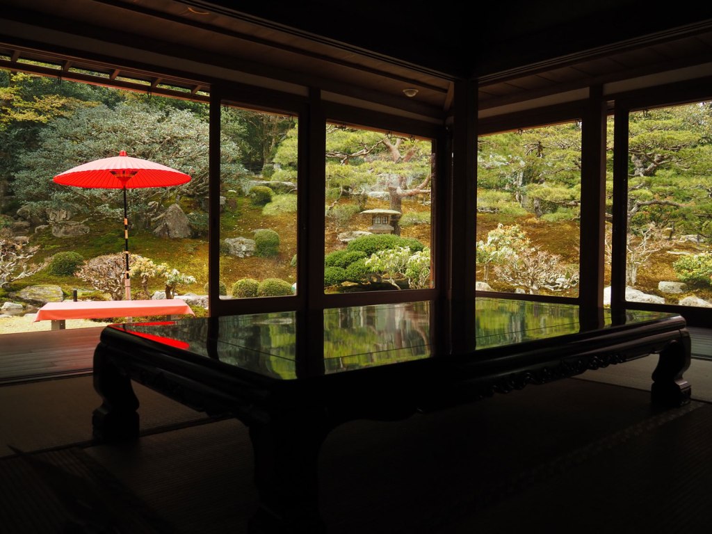 縁側から、美しい庭園にアクセントを与える真っ赤な縁台と野点傘がとても映えますなぁ。