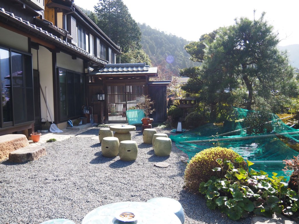 小道が終わると川沿いに少し坂が続きます。里山を超え少し山裾を進むような感じで歩いてまいりますと、本日お世話になる「大原山荘」さんに到着です。