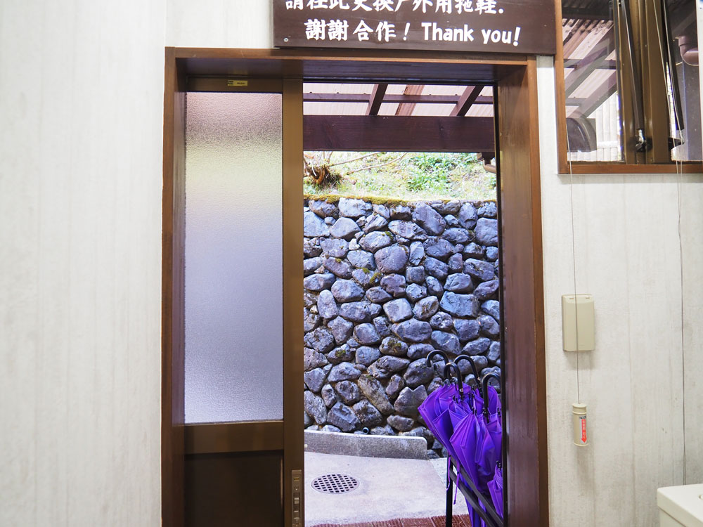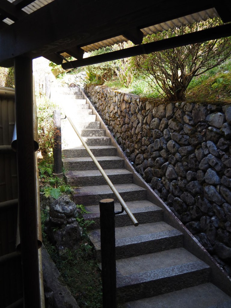 大浴場は、宿の山側へ登って行った先、石段を登って到着いたします。温泉への入り口の主屋の出口の手前にはランドリーがありますから、着替えなどを洗って乾かす事も出来るようです。