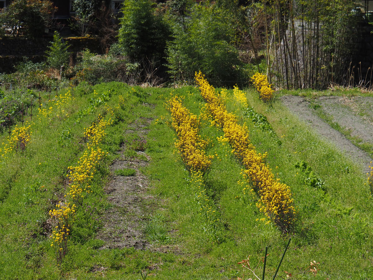 上のギャラリーがバス停から続く小道の風景です。色とりどりの春の花が咲いて、小さな畑や田んぼが並びます。