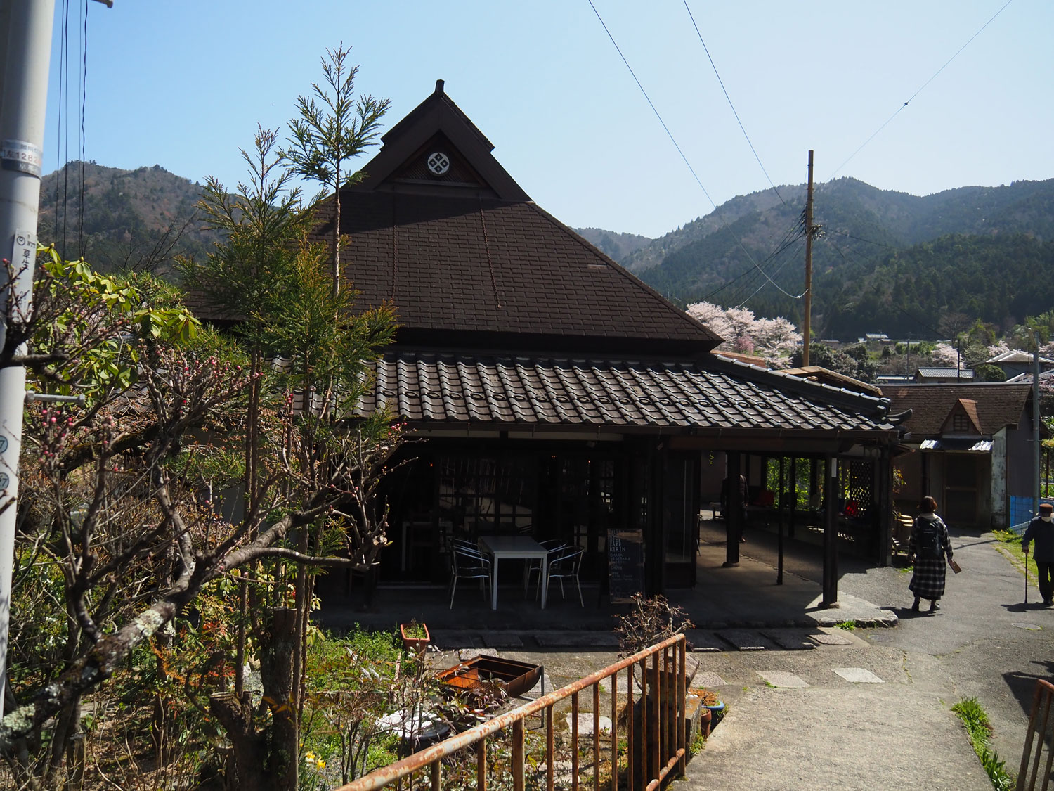 直ぐに石段があり降りていくと、里山ののどかな風景の中にレトロでおしゃれなお店が軒を連ねます。