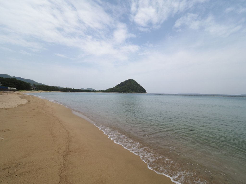 透き通った日本海と白砂のビーチに自転車を止めて、萩城があった指月山を望みます。