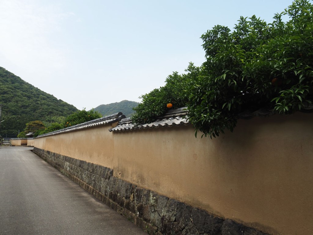鍵曲(かいまがり)と呼ばれるクランク型の道(かつて敵が攻め入った際にスムーズに入城できない様に作った道)が続いて、鍵曲沿った土壁の上から覗くミカンが美しい。