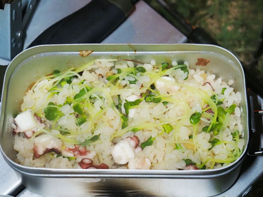 タコ、ショウガ、だし醤油、カイワレ大根をただぶっ混んで炊き上げただけですが、めちゃくちゃうまく仕上がりました!