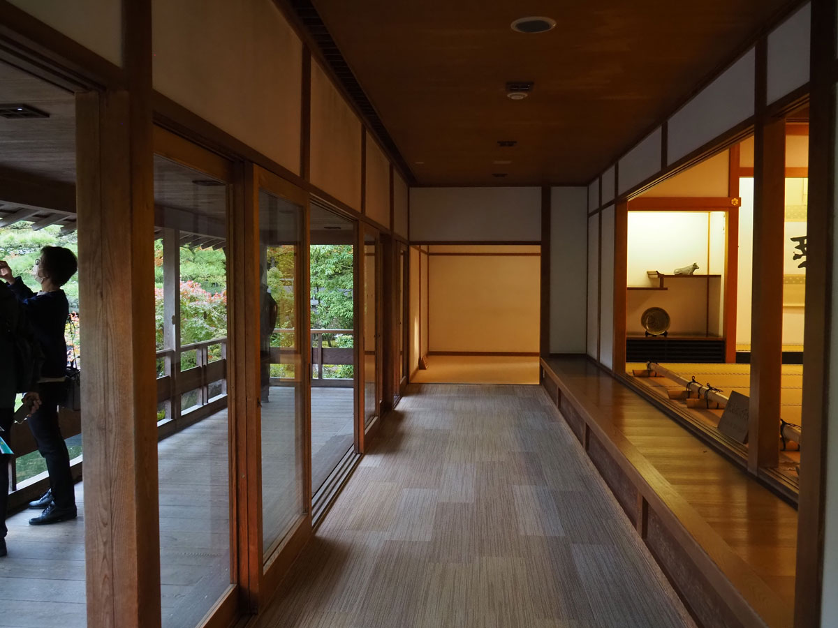 渡り廊下を抜けて到着するこちらの潮音斎は、中秋の名月を愛でるのに最良の方向に向けて建てられたそうで、観庭台から姫山原始林を借景にした雄滝と大池の眺めは壮観です。