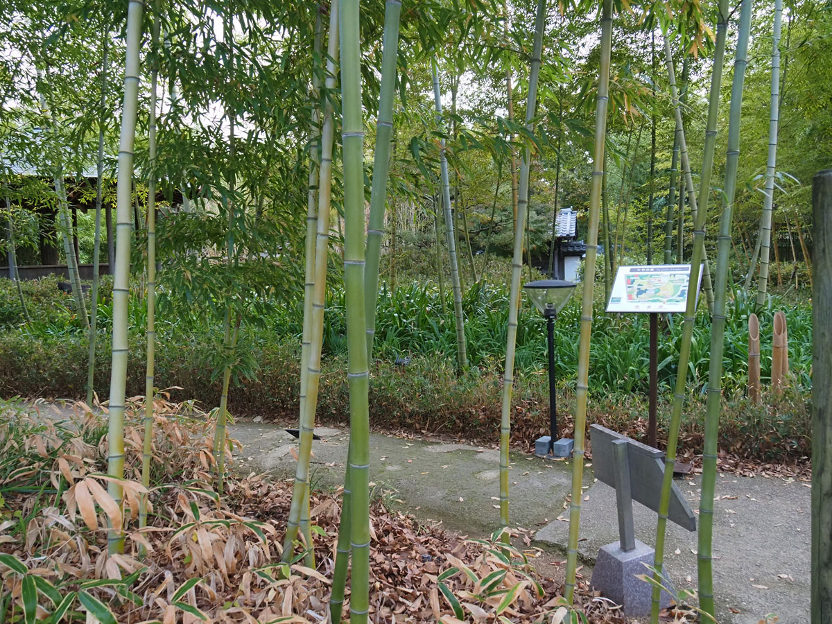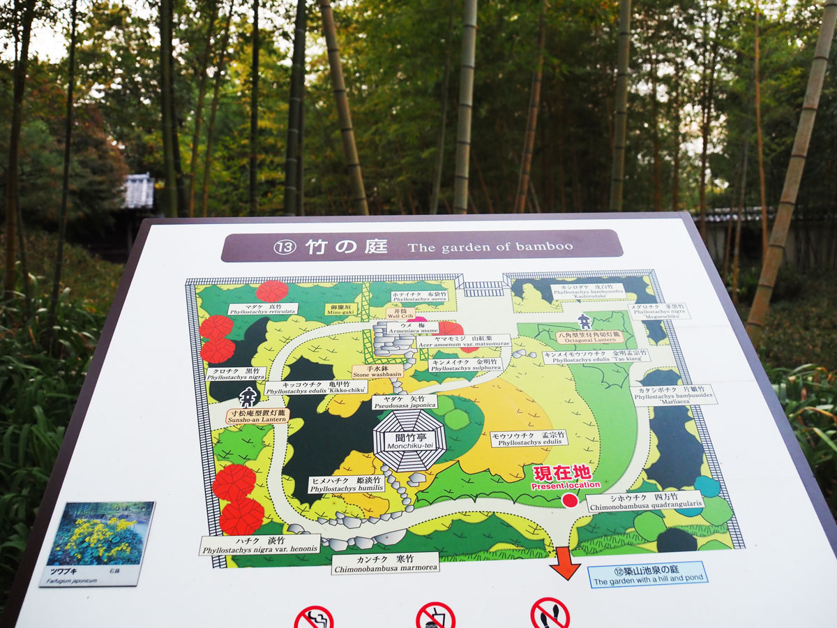最後の庭は「竹の庭」。日本の代表的な植物である竹を植栽した庭園で、竹の持つ通直性と庭園を囲む漆喰の築地塀との対比は山水画を思わせる風景を作り出しています。