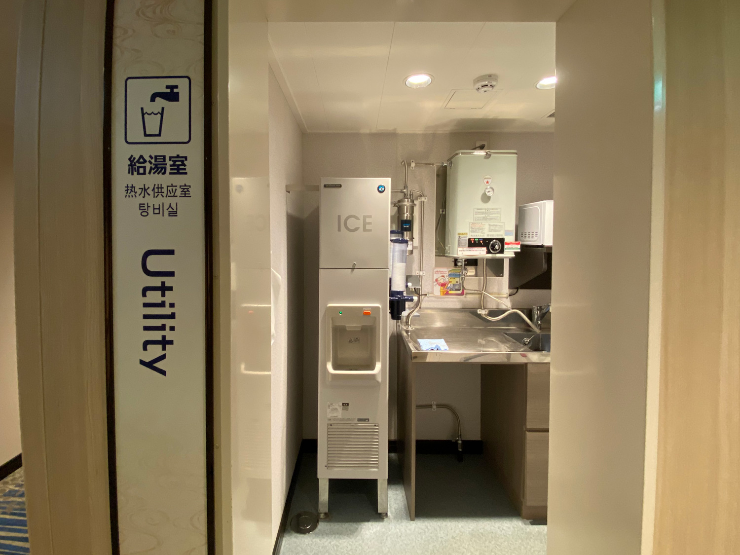 給湯室や製氷機もあり、売店などには豊富なカップ麺やお酒が売ってますのでここで作る事も可能です。