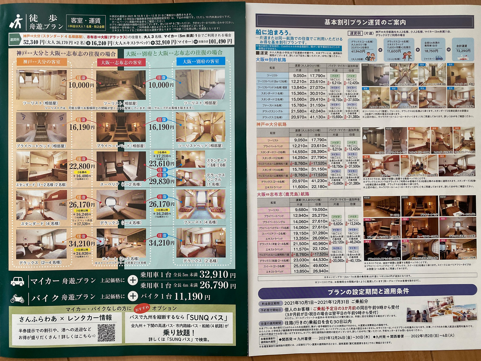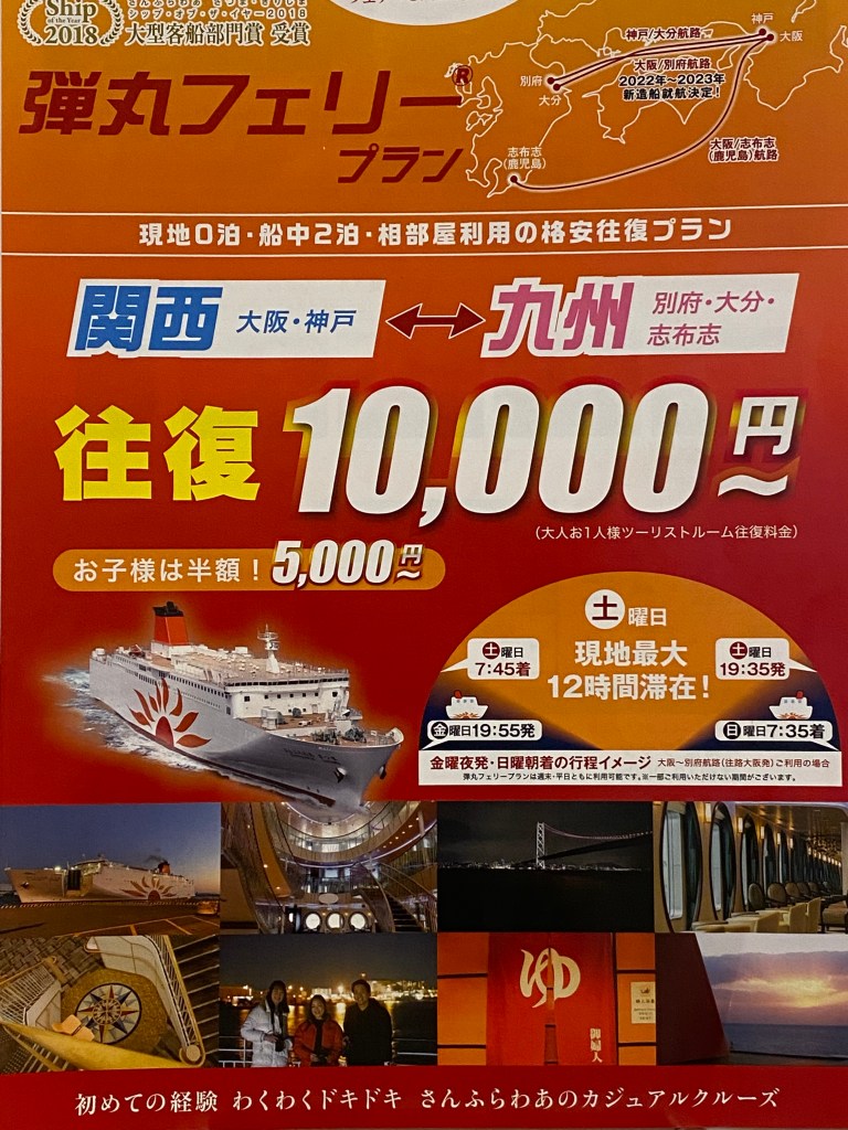 こちらは現地0泊と言う縛りがありまして、フェリー船内2泊とんぼ返りの行程となりますが、行きフェリー12時間→九州12時間→帰りフェリー12時間と、なんと休みが1日だけあれば旅計画が立てられると言う、時間がない人には非常にありがたいプランです。