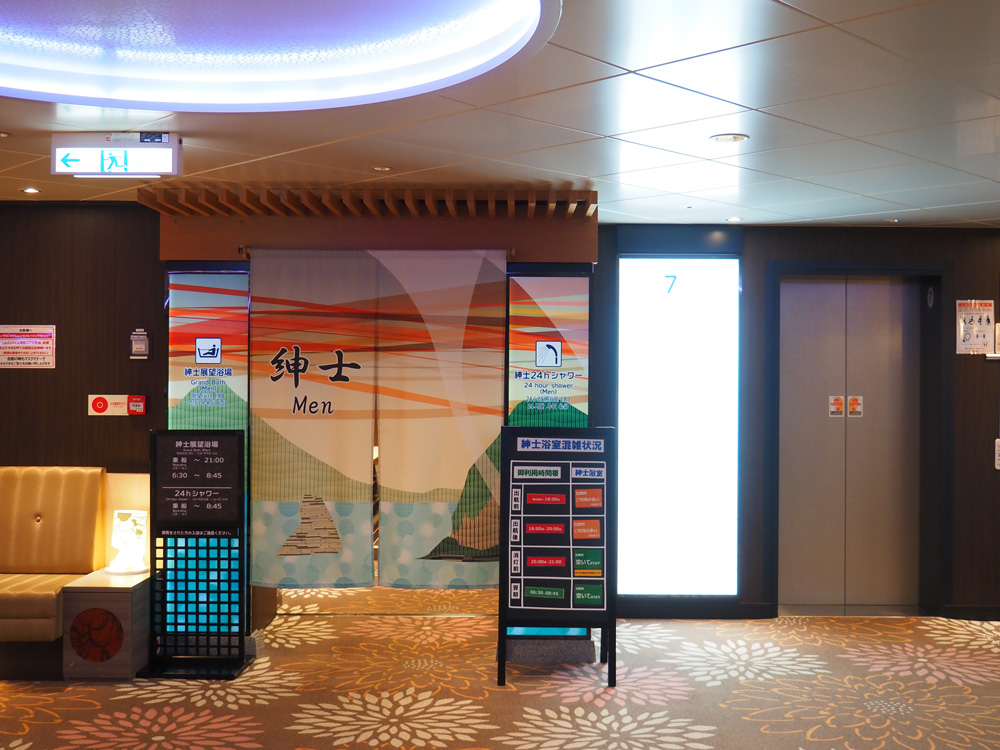7階は中央付近に大浴場がございます。アトリウムを介して右舷側が女湯、左舷側が男湯です。大浴場が苦手な方はシャワールームもございました。