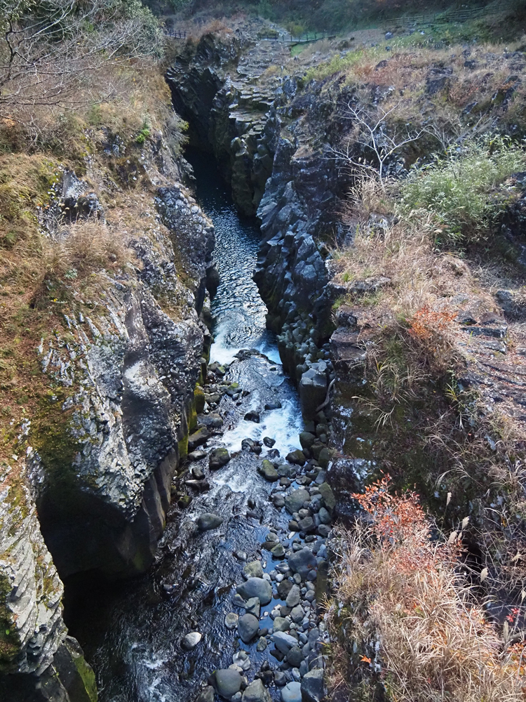 溶結凝灰岩は磨食を受けやすいため、五ヶ瀬川の侵食によって再びV字峡谷となったものが現在の高千穂峡です。切り立った断崖は7km及びます。