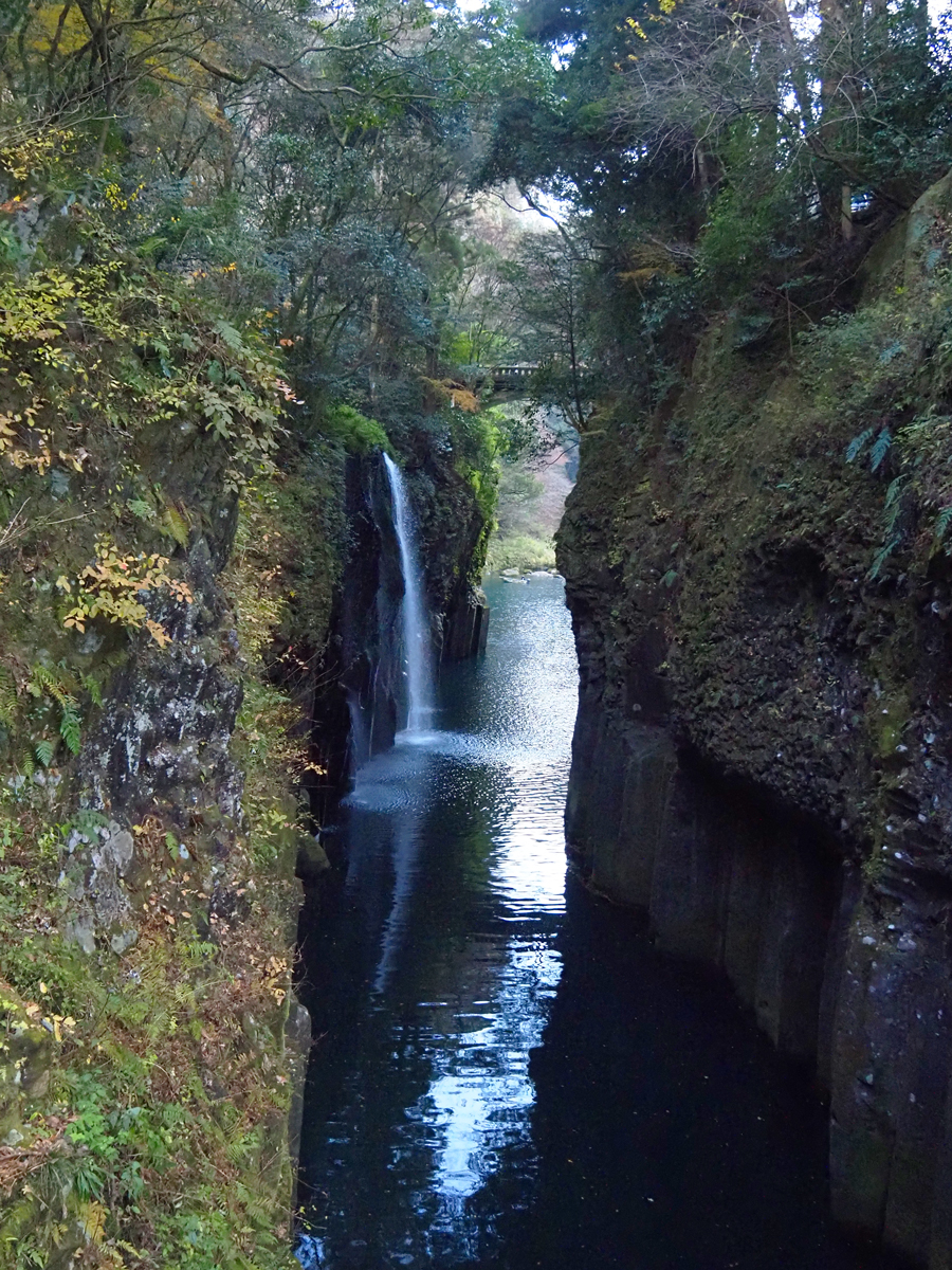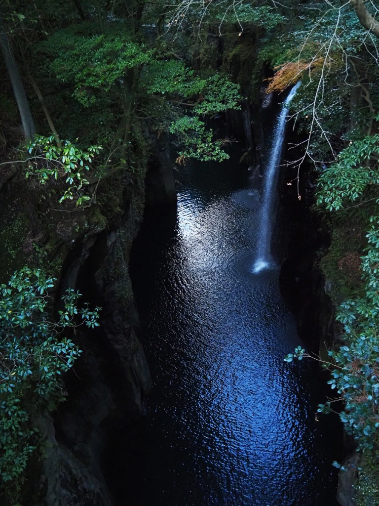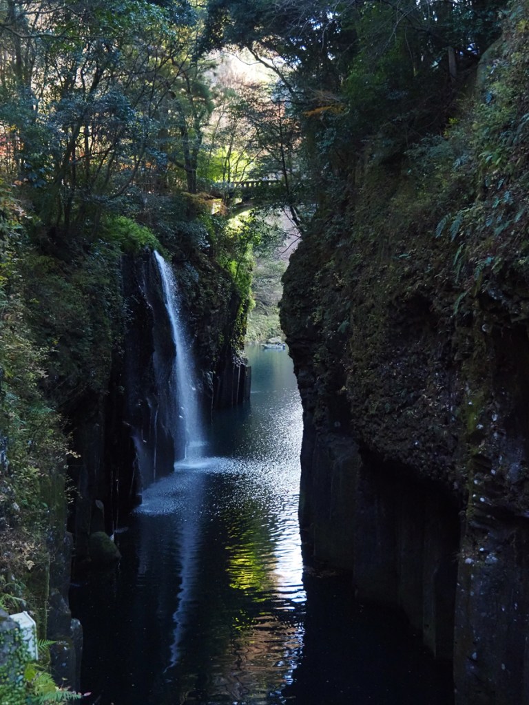 迫力ある巨大なV字峡を流れる水面に滝が落ち、その先に差し込む光と影のコントラスト。これぞ高千穂峡と言う光景でございます。