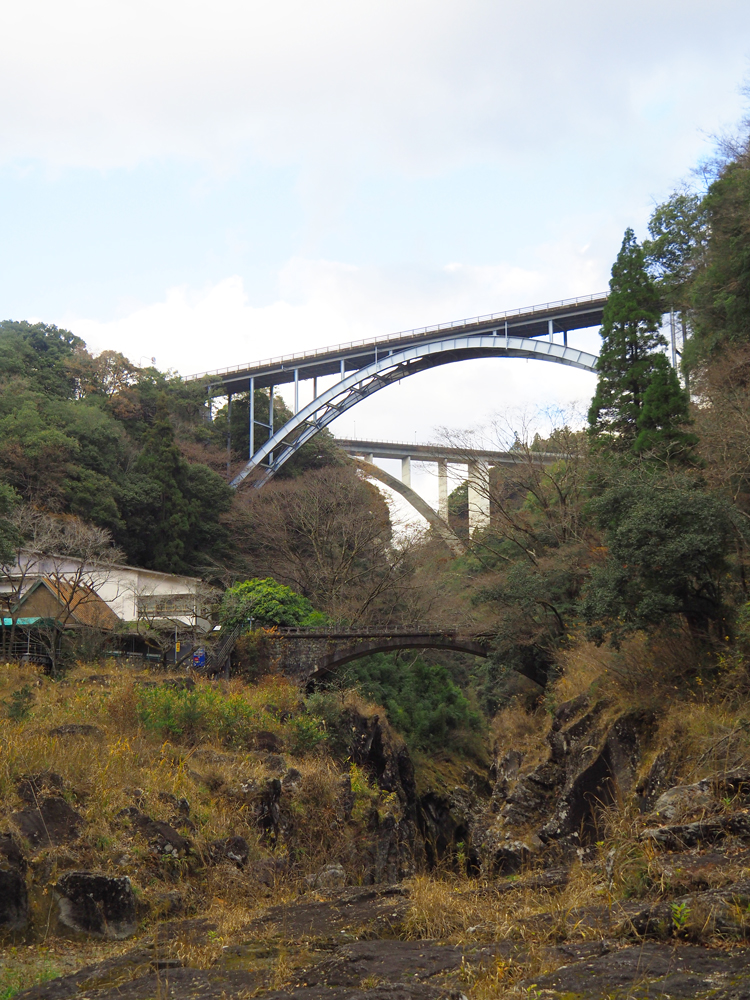 槍飛橋から上流側を望むと、高千穂の三大橋が見渡せます。奥から神都高千穂大橋、そして高千穂大橋、一番手前が神橋と、奥に行くほど大きく新しい橋になります。