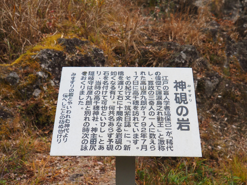 天孫降臨の際、この地に水がなかったため、天村雲命(あめのむらくものみこと)が水種を移した「天真名井」の水が滝となって流れ落ちているとされています。