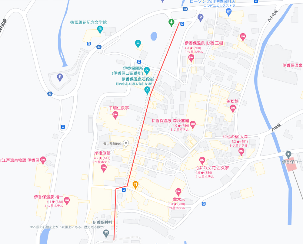 石段街を抜け伊香保神社を過ぎると人通りは少なくなり、少し静かな温泉街に様子が一転いたします。