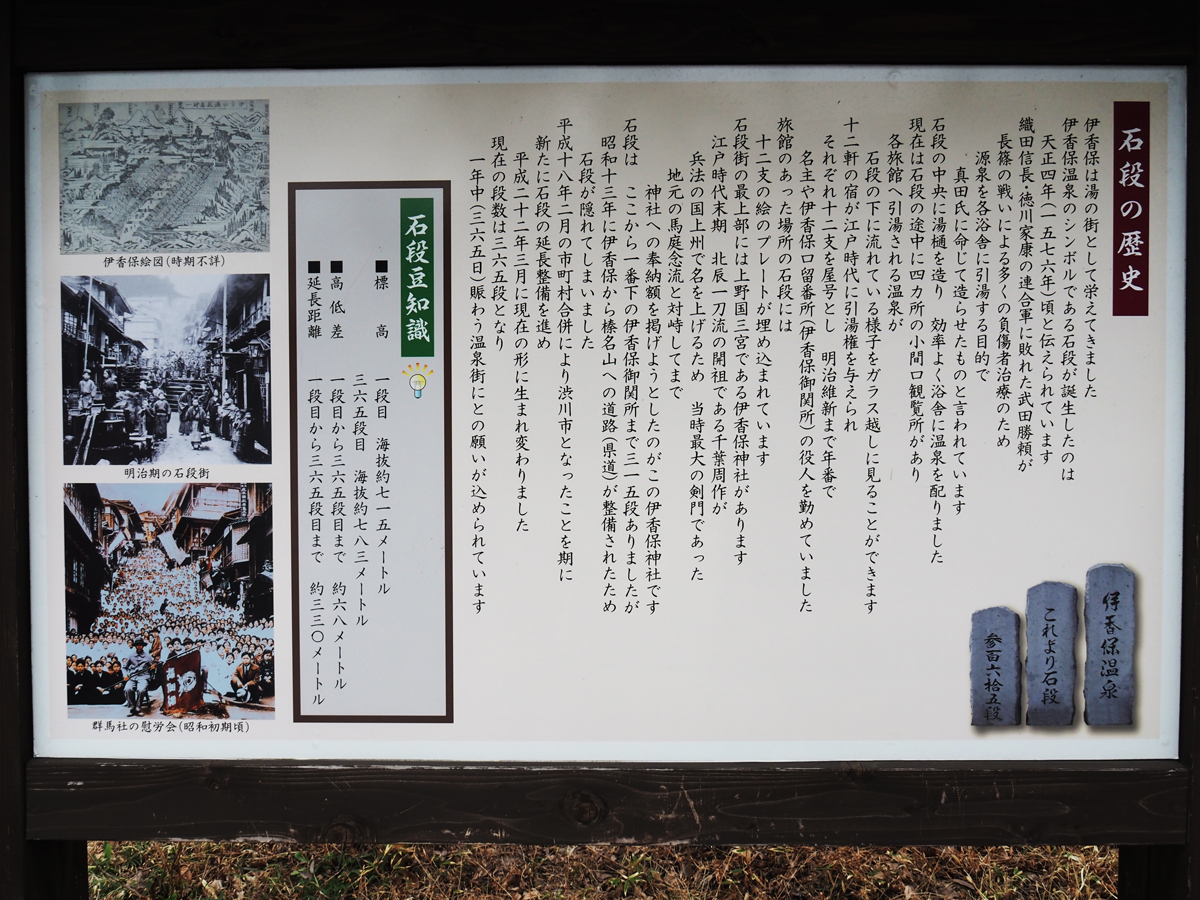 石段は伊香保温泉のシンボルで、約440年前に日本で初めて温泉都市計画に基づいて整備された温泉街と云われています。山形県山寺、香川県金毘羅と並び、日本三大名段の一つに数えられています。