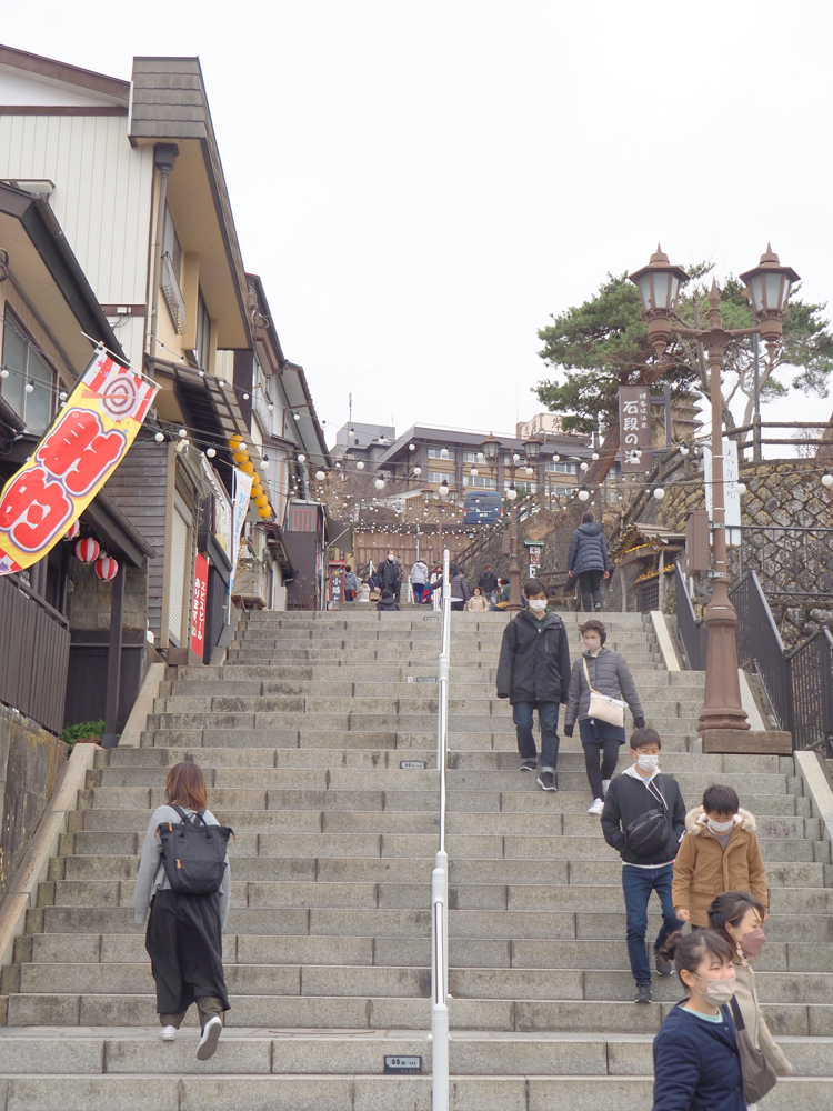 急傾斜地に連なる石段の両側に、温泉旅館、みやげ物屋、遊技場(射的・弓道)、飲食店などが軒を連ねており、今の石段は昭和55年から5年をかけて大改修されたもので、みかげ石が敷かれています。