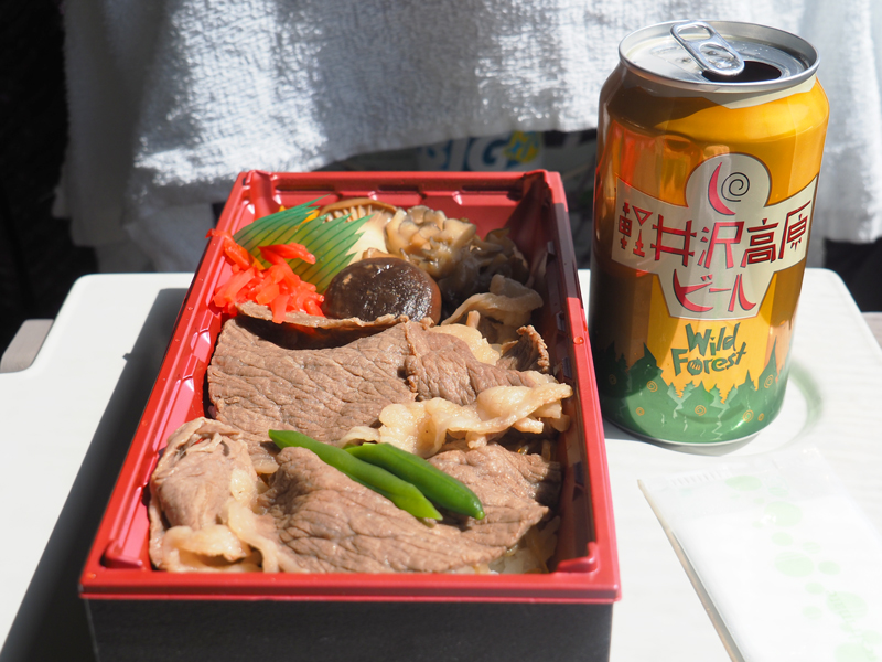上州牛すき焼き弁当と、軽井沢高原ビールを飲みながら列車からの車窓を楽しみます。
