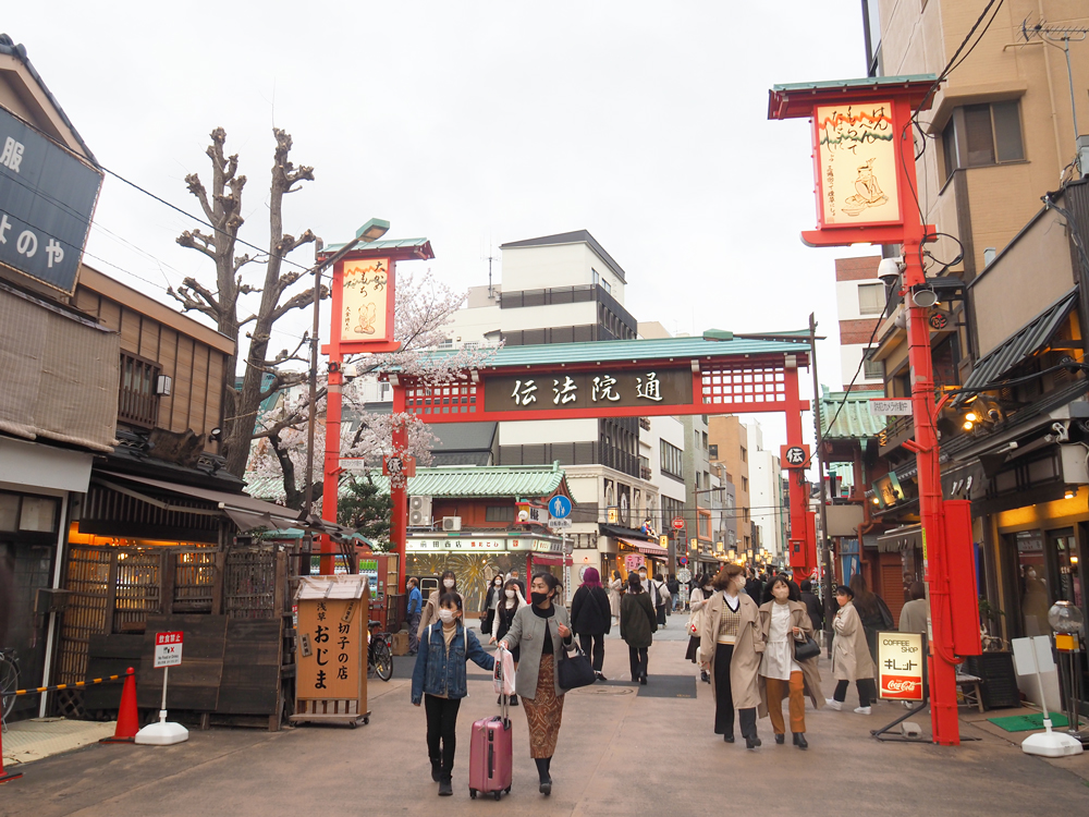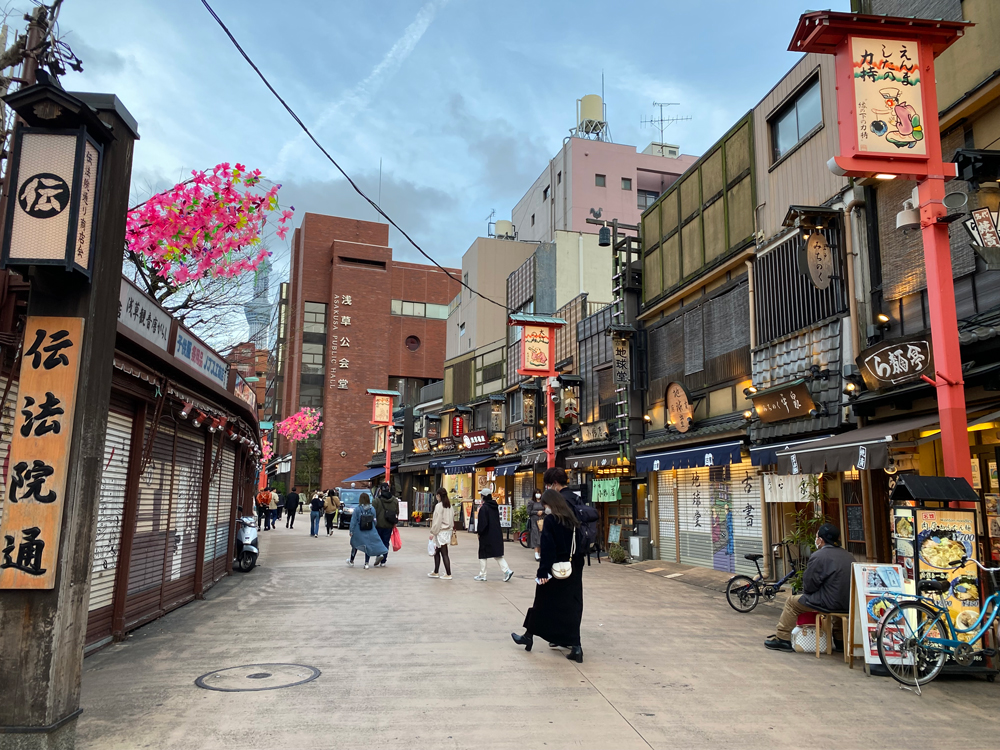 浅草寺の本坊である伝法院の門前に立ち並ぶ商店街で、仲見世通りを東西に横切る形で数十軒の店舗が並びます。