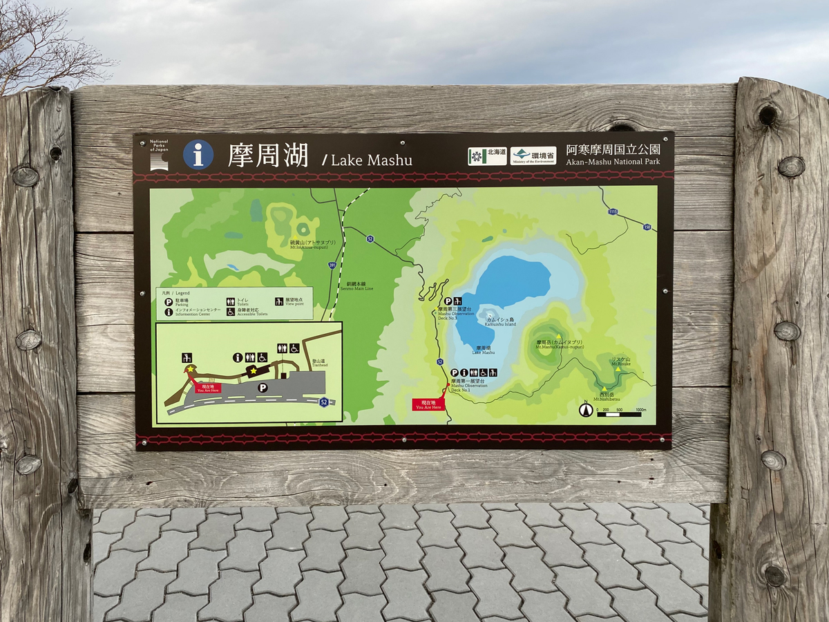 ここまで通ってきた道道52号線は表摩周の周遊道路になっていますが、冬季(11月上旬〜4月下旬)は摩周第一展望台からこれから訪れる摩周第三展望台を経てJR川湯温泉駅近までが通行止めになるため、冬の摩周湖を望めるのもここ第一展望台になります。