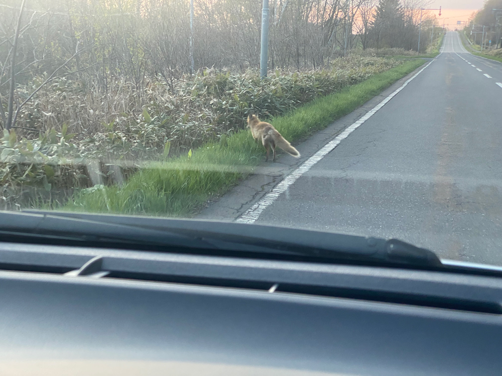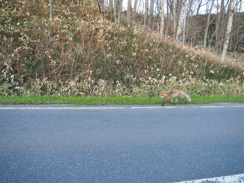 なんとキタキツネを発見。普通に狐が道を歩いているんですね。車を全く恐れません。