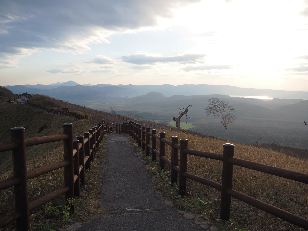 この時間は屈斜路湖が夕日に染まり美しい夕暮れの阿寒摩周国立公園を一望できました。