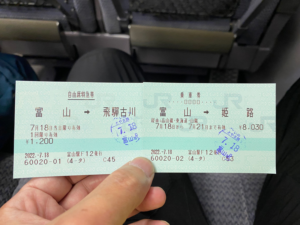 そしてみどりの窓口で乗車券を購入。富山から姫路までは100㎞以上あるので一気に姫路まで購入します。(有効期限は100キロ毎に一日ずつ増えます)それと富山発の特急ひだの自由席券を購入し、7:58発の特急ひだ号に乗り込みます。