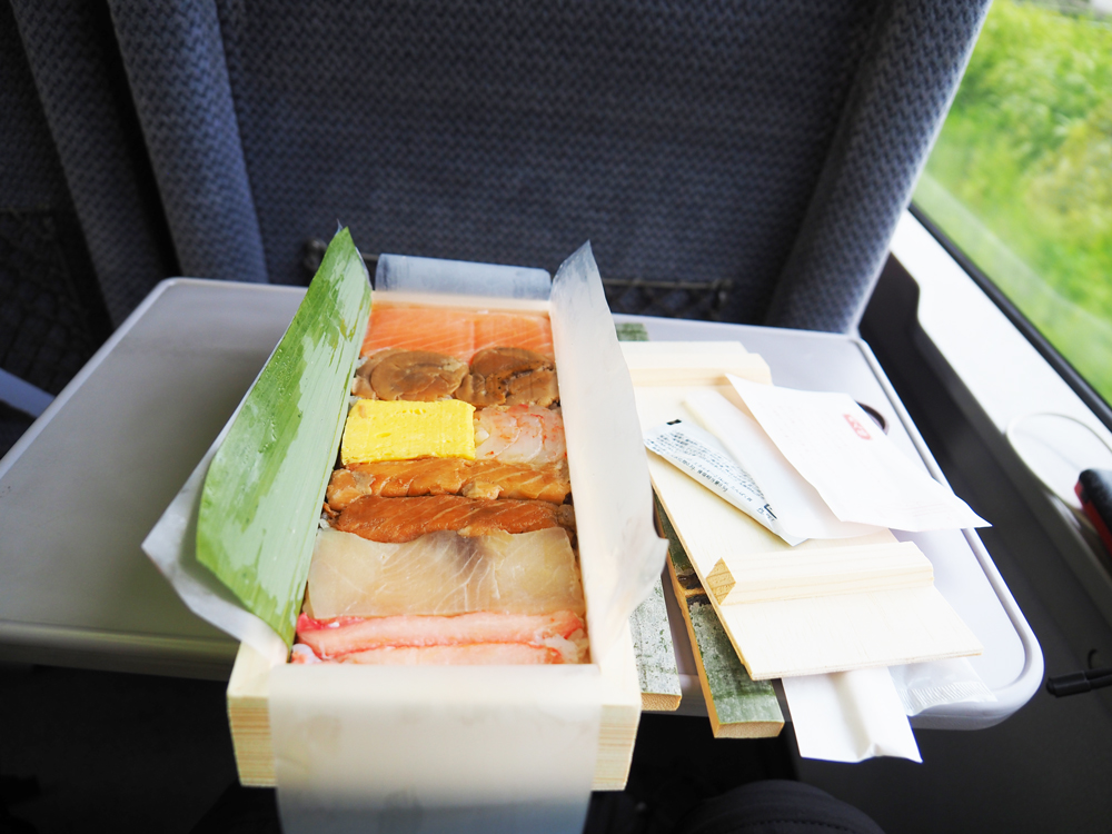 富山の駅弁と言えばますのすしですが、その老舗「源」の海鮮美食と言う押し寿司を食べながら車窓を楽しみます。