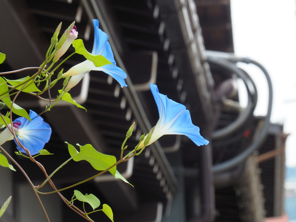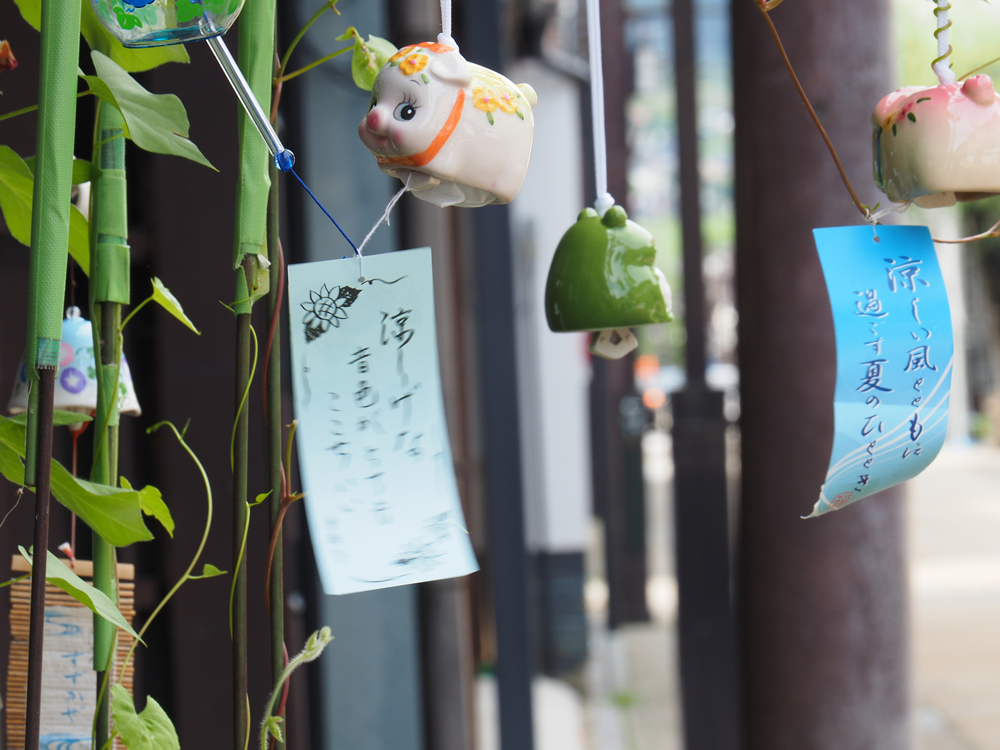 静かで人通りの少ない駅前を進んで行くと、民家の軒先に朝顔や風鈴の涼しげな音色が響きます。