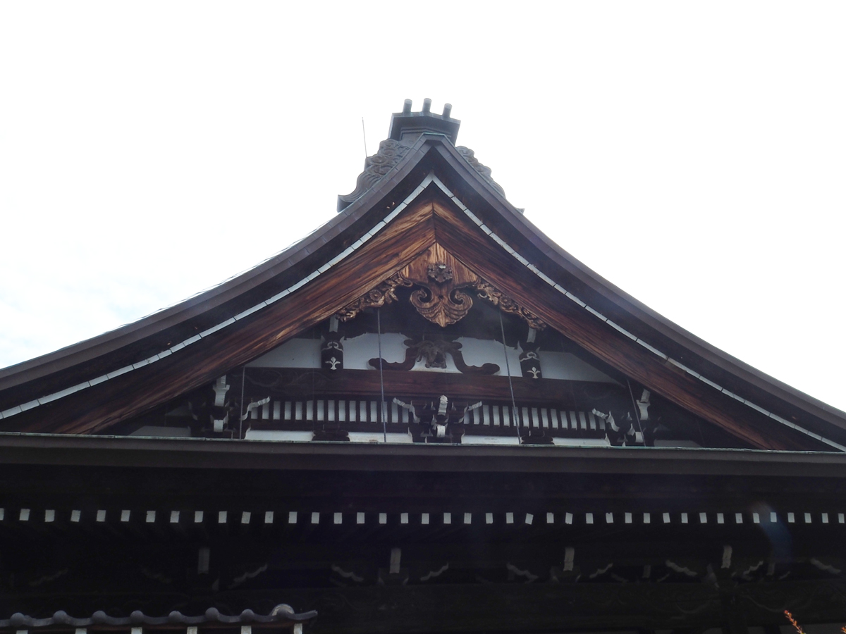 本堂の屋根下に施された亀の彫り物。この亀が、明治37年の古川町の市街地ををほとんどを焼失させた古川大火から、このお寺を守ってくれたと云われ、地元の人々は「水呼びの亀」と呼んでいます。