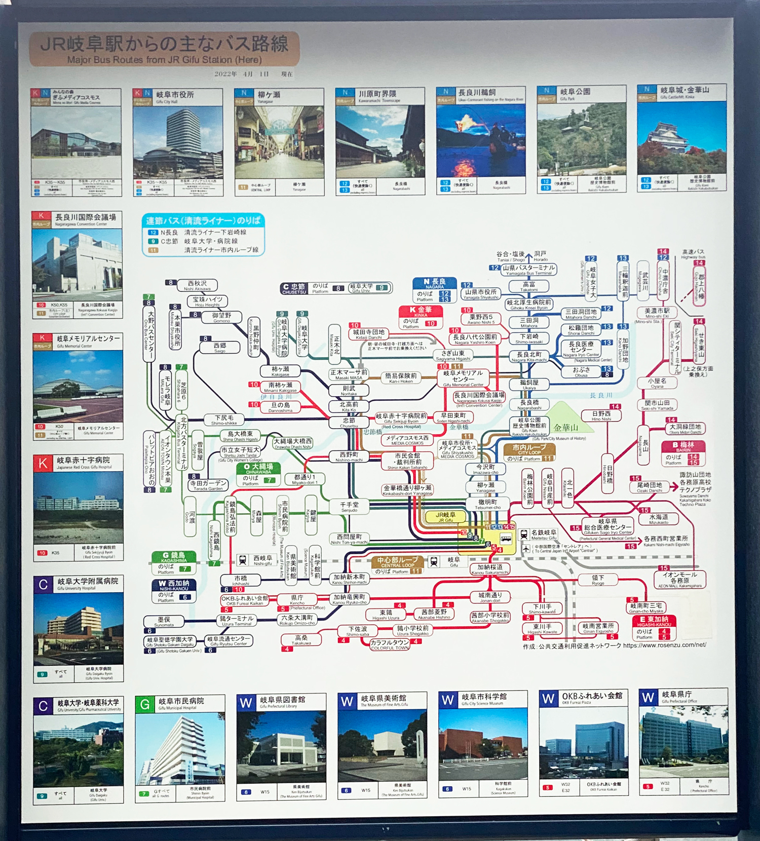 マップを見るとややこしそうですが、どうやら金華山へ行く場合は地図の上に載っている N と表示されている種別のバスに乗車すれば行けるようです。