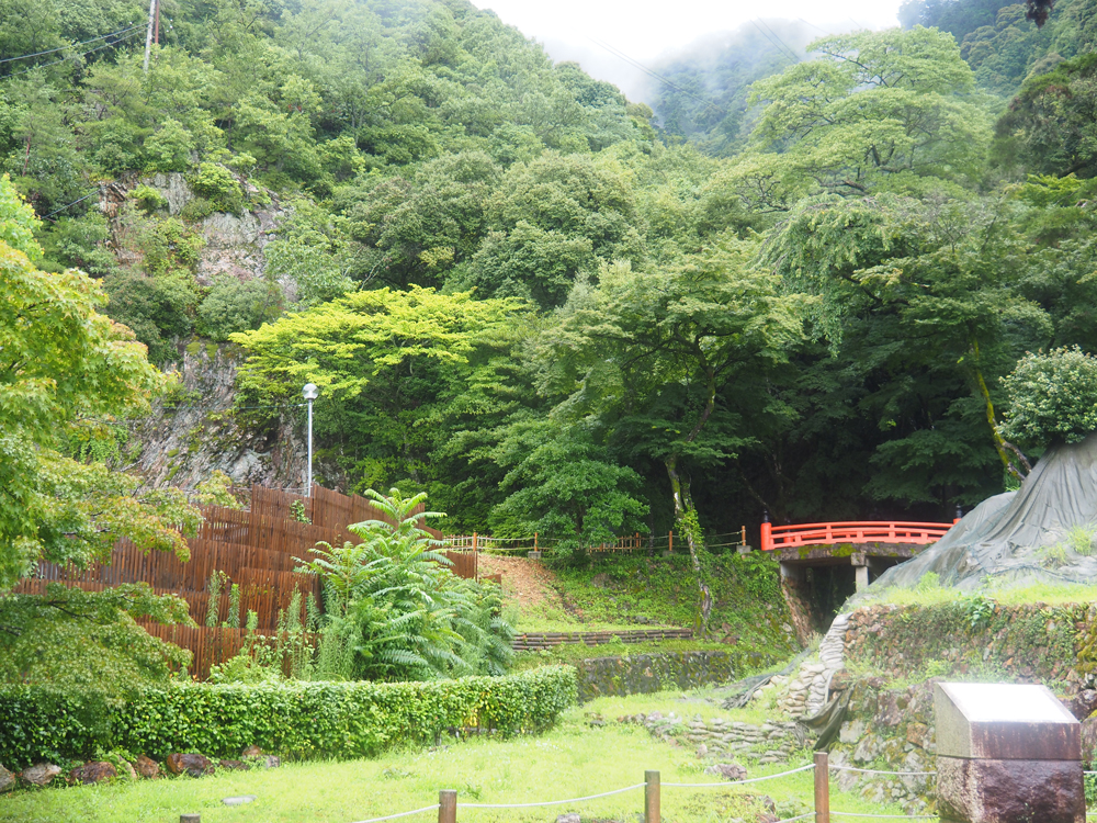 ロープウェイ乗り場の裏側へ回ると真っ赤な三重塔が見えます。そこから南へ歩くと信長居館跡(千畳敷御殿)へ。巨石を用いた通路や石垣、水路礎石などが保存整備されています。遺構と共に詳しい説明書きなどがあり往時をしのびます。