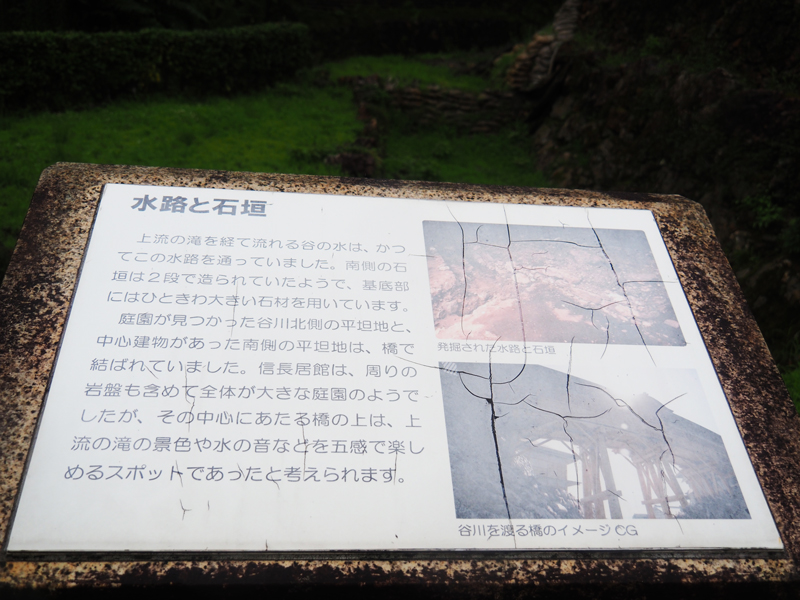 当時、御殿へと通じる道の両側に石を積んだ塀がめぐらされ、その先の上段の「千畳敷」と呼ばれるところに信長の御殿があったと云われています。
