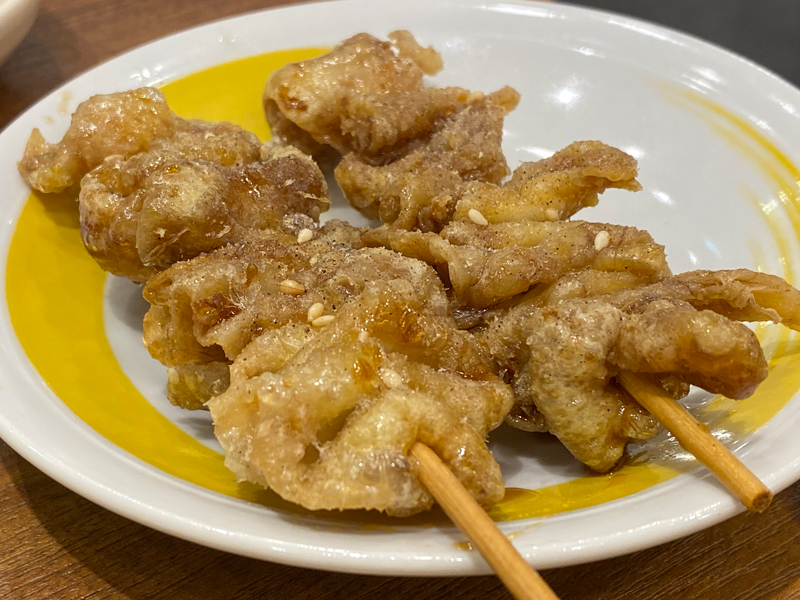 伝串と言う、鶏皮を揚げた串(一本50円)がメインの居酒屋で、なんとビール190円ハイボール150円と激安!