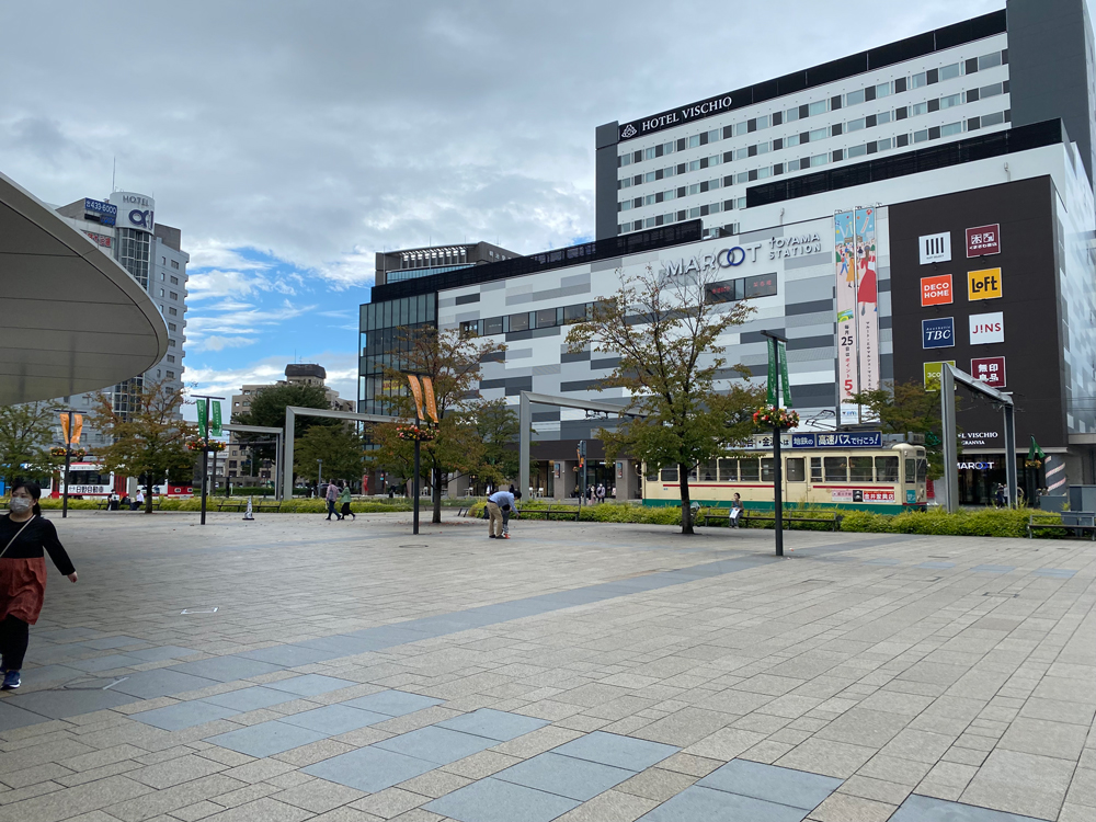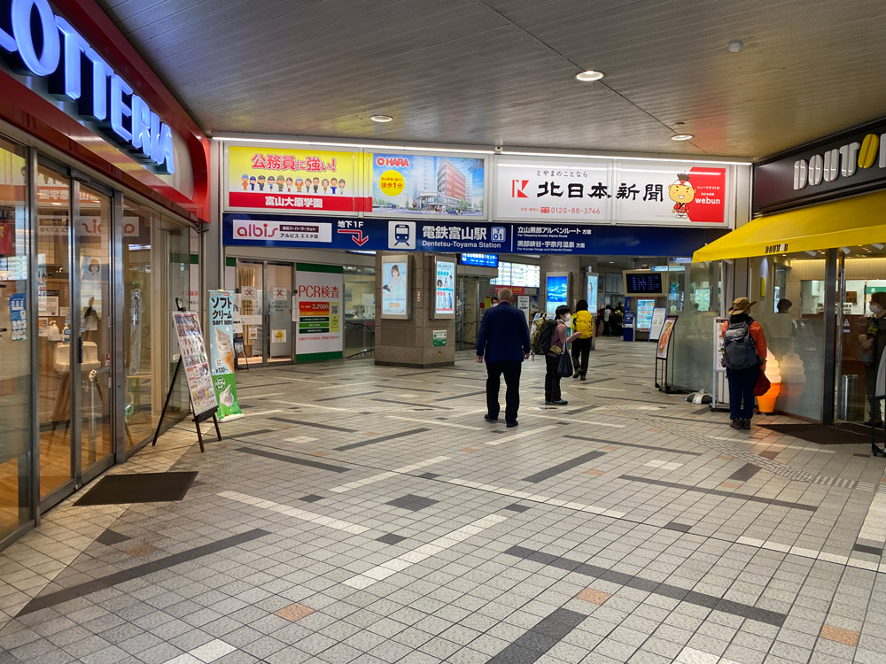 富山駅へはいつも夜行バスで来るので、新幹線で到着したのは初めてです。駅構内には富山湾の幸海鮮お寿司のモニュメントが。