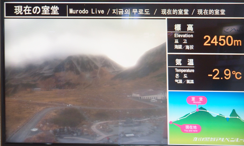 駅待合スペースのテレビ画面にそれぞれ現在の気温が表示されるのですが、只今の気温は弥陀ヶ原が6.8度、室堂はなんと氷点下2.9度です🥶
