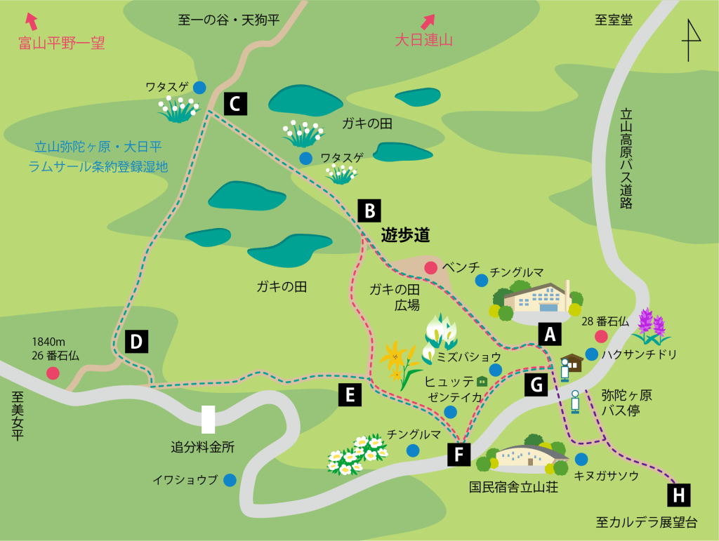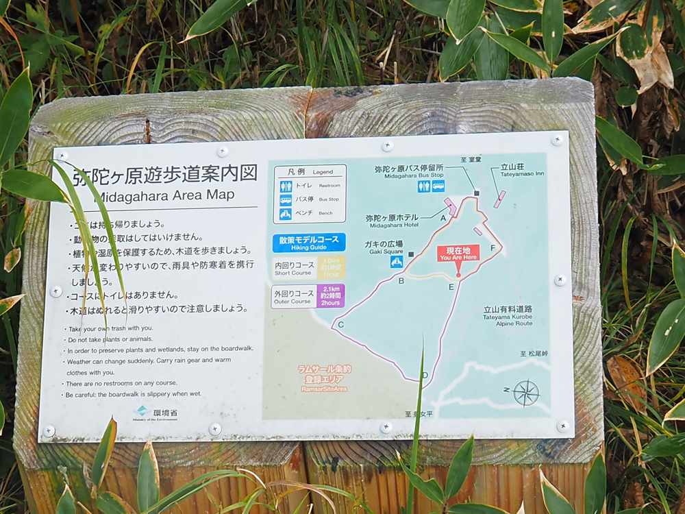 一般的な弥陀ヶ原の散策は、遊歩道を内回りに巡るお気軽コース(40分~1時間)と、外回りに巡るじっくりコース(1時間20分~2時間)の2種類があります。