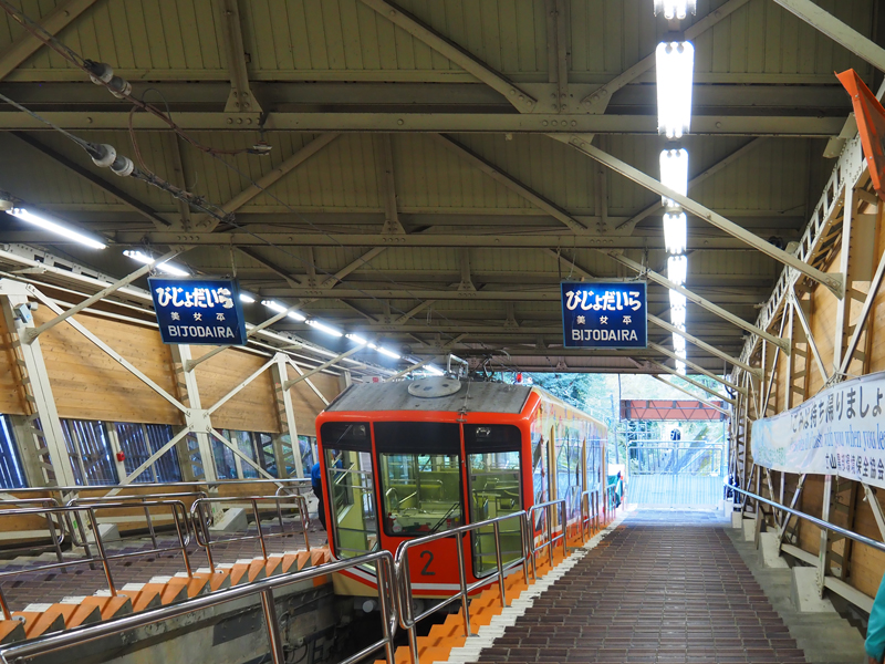まずはケーブルカーに乗車し、標高475mの立山から約7分で標高977mの美女平に到着。